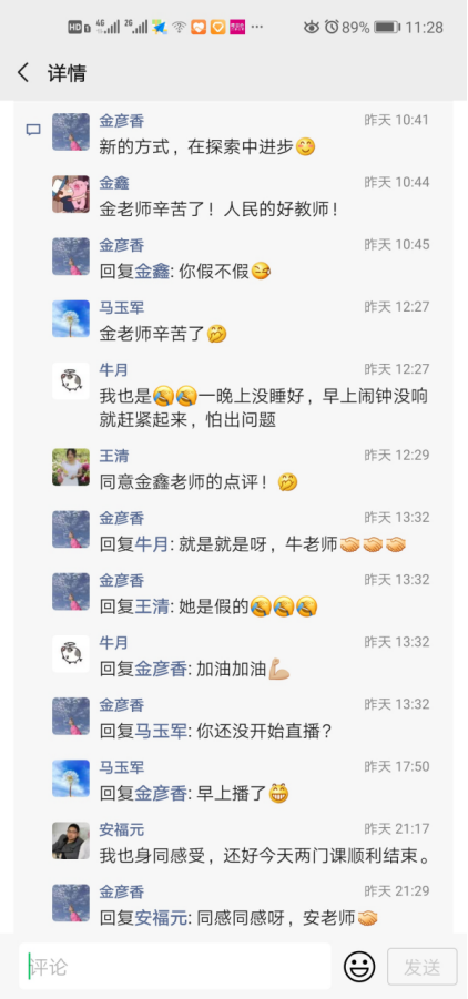 第一次接受任课老师做主播的同学们,对线上学习都充满了好奇与期待,早早地进入直播群等待课程开始,对老师在直播时遇到的各种小插曲都表示理解和体谅。同学们都说:老师和我们都是第一次上网课,大家虽然不能面对面地在一起上课,中途也可能会遇到一些麻烦,但大家都在尽量克服,只为了达到更好的学习效果。在家学习比在校时更自由,所以得靠个人自觉;但老师们会通过大学慕课等多种资源整合的方式给同学们传递更丰富、更精彩的教学内容。