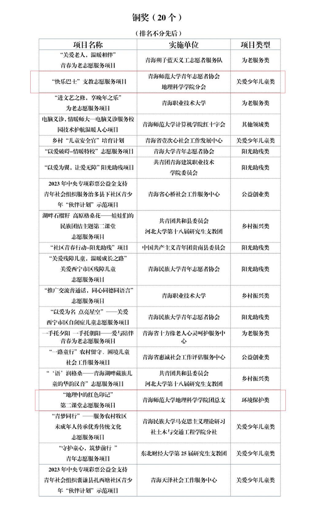 6月29日,由团省委、省青志协主办的2024年“招行杯”青海省青年志愿服务项目大赛决赛顺利举行。经过48个项目的激烈角逐,公司报送的“快乐巴士”支教志愿服务项目、“地理中的红色印记”第二课堂志愿服务项目均斩获铜奖。