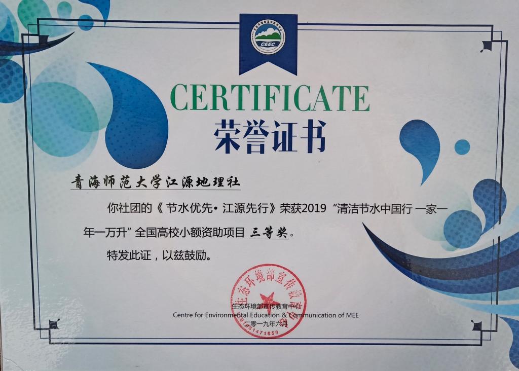 盛夏七月传捷报,金秋十月得收获。由生态环境部宣传教育中心主办的全国小额资助项目“清洁节水中国行,一家一年一万升”获奖名单已揭晓,BV伟德官方网站江源地理社参选的“节水优先,江源先行”项目荣获三等奖。