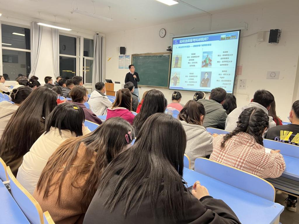 讲座上,张进虎老师从“为什么要考研”“如何选择报考科研院所”“推荐院校历年分数统计”“上岸学子考研经验分享”等四个方面进行了生动详细的阐述,并结合近年来考研大数据、公司研究生招录情况等方面,与现场同学互动交流。最后,在备考时间、复习方法上进行了深入辅导。同学们认真聆听,积极互动,气氛热烈。