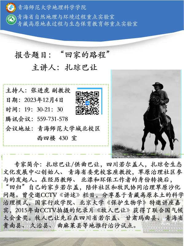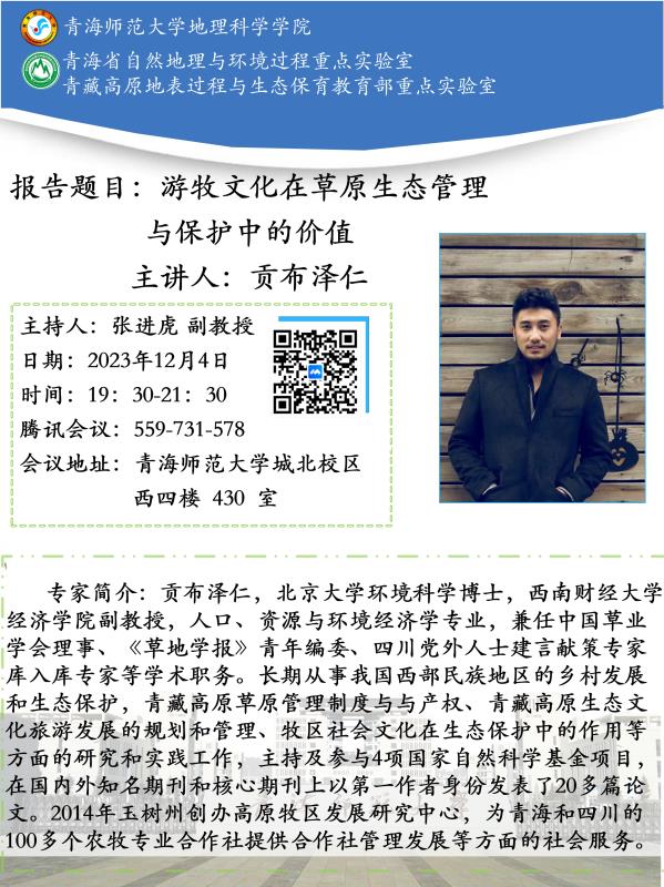 应地理公司、省重点实验室、教育部重点实验室硕士生导师张进虎副教授的邀请,西南财经大学副教授贡布泽仁、扎琼仓生态文化发展中心创始人、青海省党校客座教授扎琼巴让将于2023年12月4日在城北校区西四楼430室进行学术交流,具体信息如下: